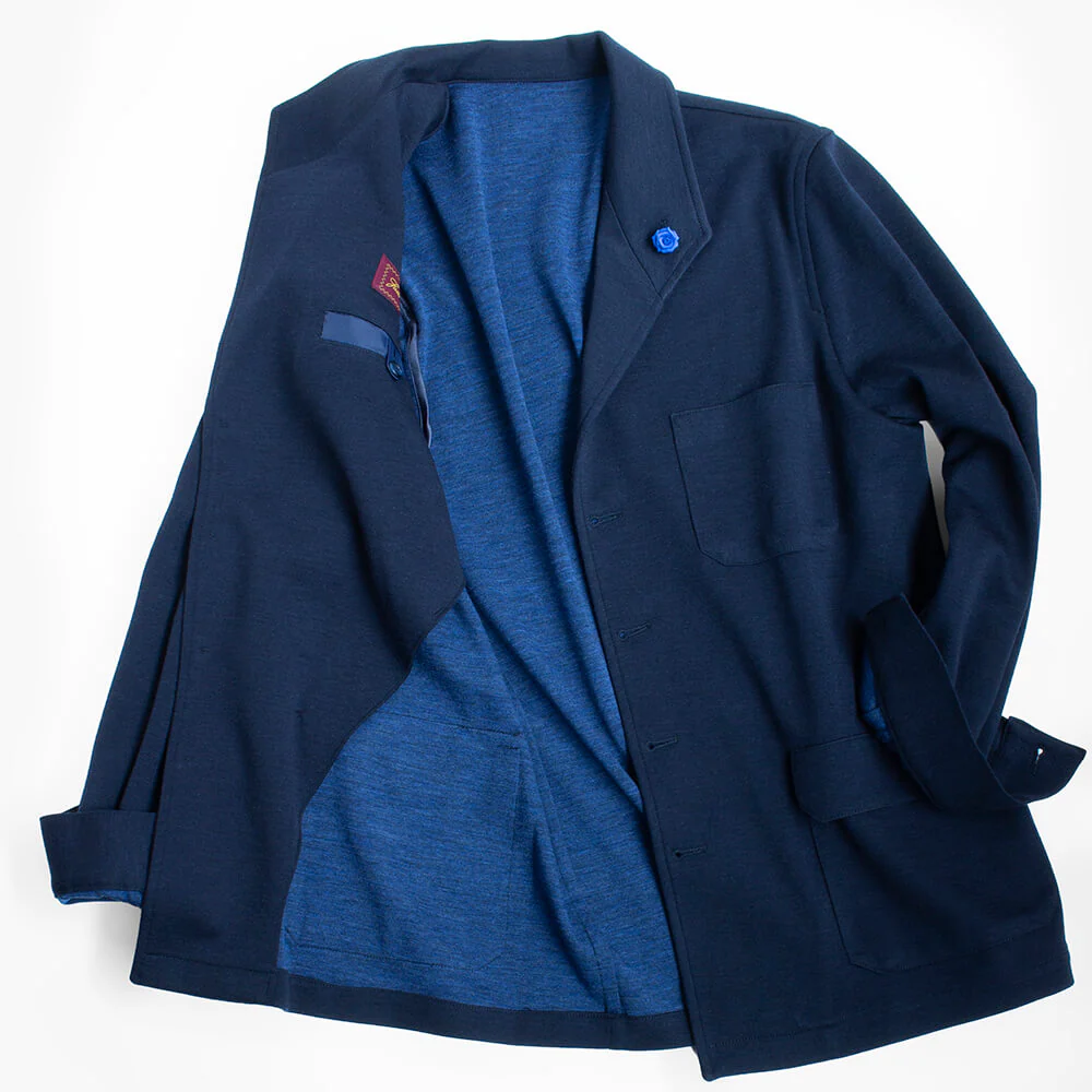 First is the navy jersey model. Highly stretchable and comfortable, it moves naturally with your body—light enough to wear like a cardigan.